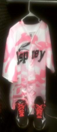 The 2012 version is a camouflage version, with two shades of pink in camo form on the jersey, with the traditional Osprey across the chest.